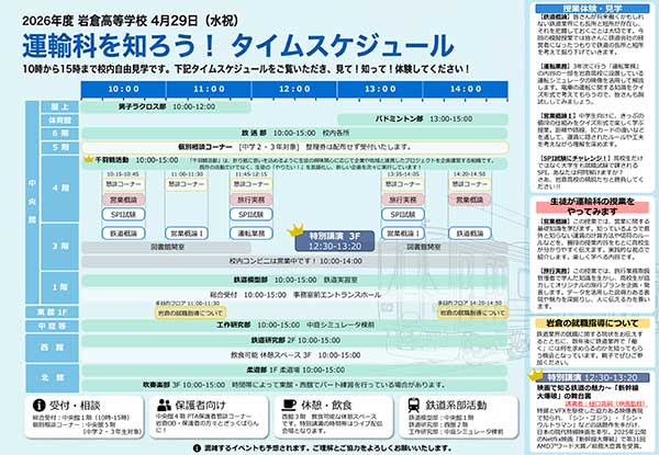 当日は、運輸科の授業体験、就職指導の状況に関する説明のほか、岩倉高校ならではの「特別講演」が実施される予定です。
